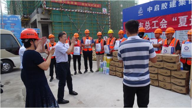 8月19日上午,膠州市委副書記李曉光,膠州市總工會(huì)主席姜鵬,副主席孫殿開等一行到中啟膠建集團(tuán)膠州公司施工建設(shè)的新源上城明珠項(xiàng)目施工現(xiàn)場(chǎng)開展“夏送清涼”慰問活動(dòng),為炎炎夏日依然奮戰(zhàn)在一線的職工們送上工會(huì)的暖心清涼物資和親切的問候。集團(tuán)黨委副書記、工會(huì)主席孫淑云等陪同前往活動(dòng)現(xiàn)場(chǎng)。