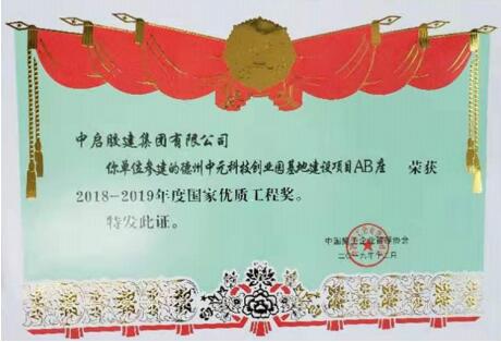 2019年12月8日,國(guó)家優(yōu)質(zhì)工程獎(jiǎng)總結(jié)表彰大會(huì)在國(guó)家會(huì)議中心召開,中啟膠建集團(tuán)青島公司參建的“德州中元科技創(chuàng)業(yè)園基地建設(shè)項(xiàng)目AB座工程”榮獲國(guó)家優(yōu)質(zhì)工程獎(jiǎng)。