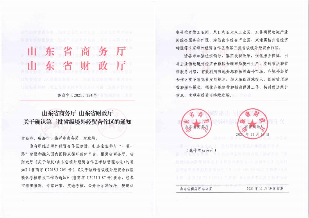 2021年11月19日,根據(jù)《山東省商務(wù)廳、山東省財(cái)政廳關(guān)于確認(rèn)第三批省級(jí)境外經(jīng)貿(mào)合作區(qū)的通知》(魯商字﹝2021﹞154號(hào)),柬埔寨桔井省經(jīng)濟(jì)特區(qū)確認(rèn)為第三批省級(jí)境外經(jīng)貿(mào)合作區(qū)。