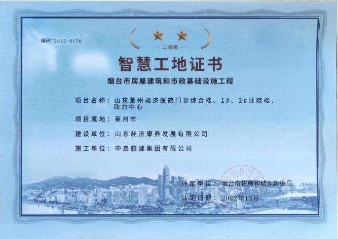 近日,由集團建筑二分公司承建的山東萊州昶濟醫(yī)院門診綜合樓、1#、2#住院樓、動力中心項目榮獲“煙臺市建筑施工二星級智慧工地”,充分展現(xiàn)公司的建設(shè)實力、科技實力以及自主創(chuàng)新實力,在煙臺市建筑業(yè)企業(yè)中起到引領(lǐng)示范作用。