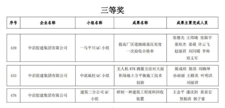 集團(tuán)在省外QC成果也取得了較好的成績(jī)。膠州公司在安徽省參加的QC成果活動(dòng)中榮獲一等獎(jiǎng)1項(xiàng),二等獎(jiǎng)1項(xiàng);建筑二公司在內(nèi)蒙古自治區(qū)參加的QC成果活動(dòng)中榮獲三等獎(jiǎng)3項(xiàng)。