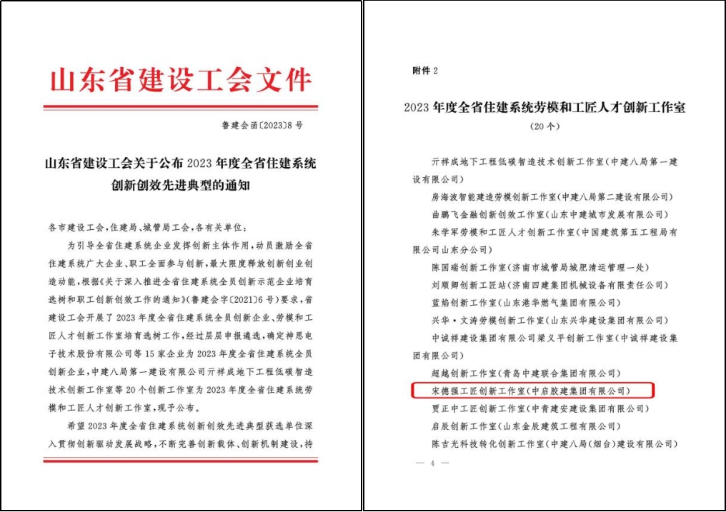近日,山東省建設工會委員會公布了20個山東省住建系統(tǒng)工匠人才創(chuàng)新工作室。其中,中啟膠建集團有限公司“宋德強工匠創(chuàng)新工作室”被評為“2023年度山東省住建系統(tǒng)工匠人才創(chuàng)新工作室”。