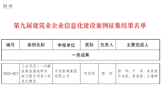 12月1日,中國建筑業(yè)協(xié)會(huì)公布了第九屆建筑業(yè)企業(yè)信息化建設(shè)案例征集活動(dòng)結(jié)果,中啟膠建集團(tuán)承建的一汽解放青島基地研發(fā)能力提升項(xiàng)目榮獲“一類成果”佳績。