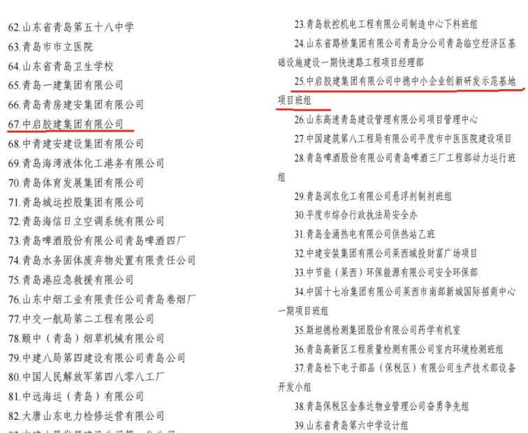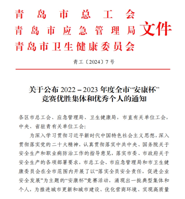 近日,青島市總工會、青島市應(yīng)急管理局、青島市衛(wèi)生健康委員會聯(lián)合公布了2022-2023年度全市“安康杯”競賽獲獎名單,中啟膠建集團有限公司獲評青島市“安康杯”競賽優(yōu)勝單位,中德中小企業(yè)創(chuàng)新研發(fā)示范基地項目班組獲評青島市“安康杯”競賽優(yōu)勝班組。