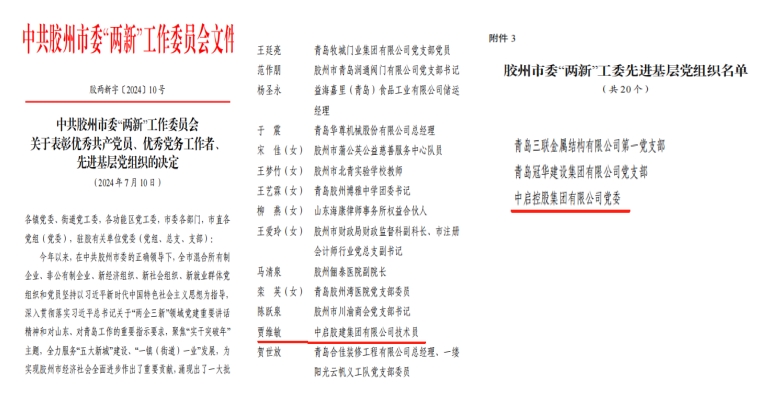 近日,市各級(jí)黨委為表彰先進(jìn)、弘揚(yáng)正氣,激勵(lì)廣大黨員和各級(jí)黨組織牢記囑托、勇?lián)姑?,在慶祝中國(guó)共產(chǎn)黨成立103周年之際,通報(bào)表?yè)P(yáng)了一批優(yōu)秀個(gè)人和先進(jìn)集體,集團(tuán)黨委喜獲多項(xiàng)殊榮。集團(tuán)黨委書記、總裁張?jiān)霾緲s獲青島市非公經(jīng)濟(jì)組織“黨員先鋒崗”和膠州市優(yōu)秀黨務(wù)工作者稱號(hào);中啟膠建集團(tuán)裝飾公司賈維敏同志榮獲膠州市委“兩新”工委優(yōu)秀共產(chǎn)黨員稱號(hào);中啟控股集團(tuán)黨委榮獲膠州市委“兩新”工委先進(jìn)基層黨組織稱號(hào);集團(tuán)黨委所屬的中啟控股集團(tuán)機(jī)關(guān)黨支部、中啟膠建集團(tuán)膠州公司黨支部和中啟膠建集團(tuán)青島公司黨支部獲評(píng)“2023年度膠州市五星級(jí)黨組織”稱號(hào)。