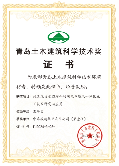 日前,在青島市土木建筑工程學會首次開展的“青島土木建筑科學技術獎”評選活動中,我公司的研發(fā)項目《施工現(xiàn)場永臨結(jié)合利用光導通風一體化施工技術研發(fā)與應用》榮獲三等獎。