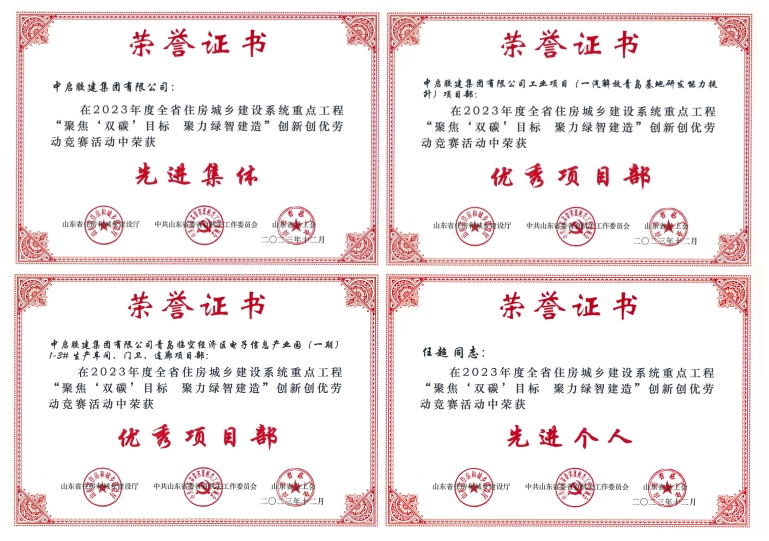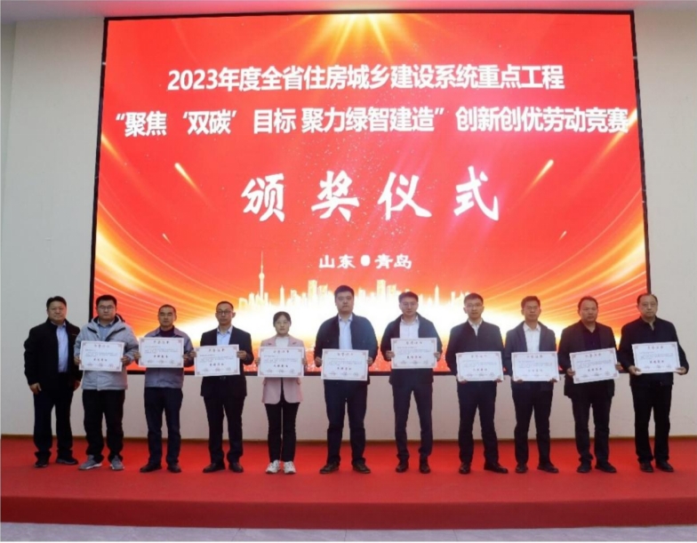 會議同期為青島市獲得2023年度全省住房城鄉(xiāng)建設(shè)系統(tǒng)重點工程“聚焦‘雙碳’目標(biāo) 聚力綠智建造”創(chuàng)新創(chuàng)優(yōu)勞動競賽榮譽(yù)的先進(jìn)集體、優(yōu)秀項目部和先進(jìn)個人進(jìn)行了頒獎。公司獲評“先進(jìn)集體”榮譽(yù)稱號,公司工業(yè)項目(一汽解放青島基地研發(fā)能力提升)項目部和青島臨空經(jīng)濟(jì)區(qū)電子信息產(chǎn)業(yè)園(一期)1-3#生產(chǎn)車間、門衛(wèi)、連廊項目部被評為“優(yōu)秀項目部”,任超獲評“先進(jìn)個人”。