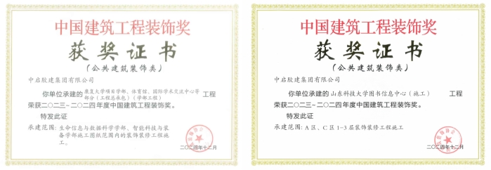 大會發(fā)布了2023年度中國建筑裝飾協(xié)會行業(yè)綜合數(shù)據(jù)統(tǒng)計報告,并頒發(fā)了2023-2024年度第一批中國建筑工程裝飾獎。中啟膠建集團建筑七公司承建的康復(fù)大學項目學部、體育館、國際學術(shù)交流中心等部分(工程總承包)(學部工程);建筑九公司承建的山東科技大學圖書信息中心(施工)兩個項目入選。