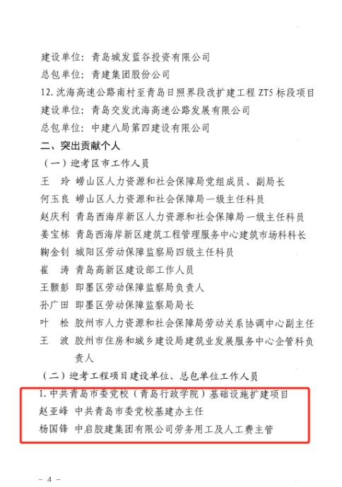 2024年,在公司領(lǐng)導(dǎo)的正確帶領(lǐng)下,在各單位各項(xiàng)目的大力支持和相關(guān)工作人員辛勤付出下,公司在保障農(nóng)民工工資支付工作方面先后圓滿完成了各項(xiàng)調(diào)研、檢查工作并取得了優(yōu)異成績(jī)。為表彰我公司在保障農(nóng)民工工資支付工作方面做出的突出貢獻(xiàn),青島市人社局、膠州市人社局分別向公司發(fā)來(lái)感謝信,對(duì)公司及在調(diào)研、檢查工作中做出突出貢獻(xiàn)的先進(jìn)項(xiàng)目和先進(jìn)個(gè)人魏翠英、楊國(guó)鋒進(jìn)行通報(bào)表?yè)P(yáng)。